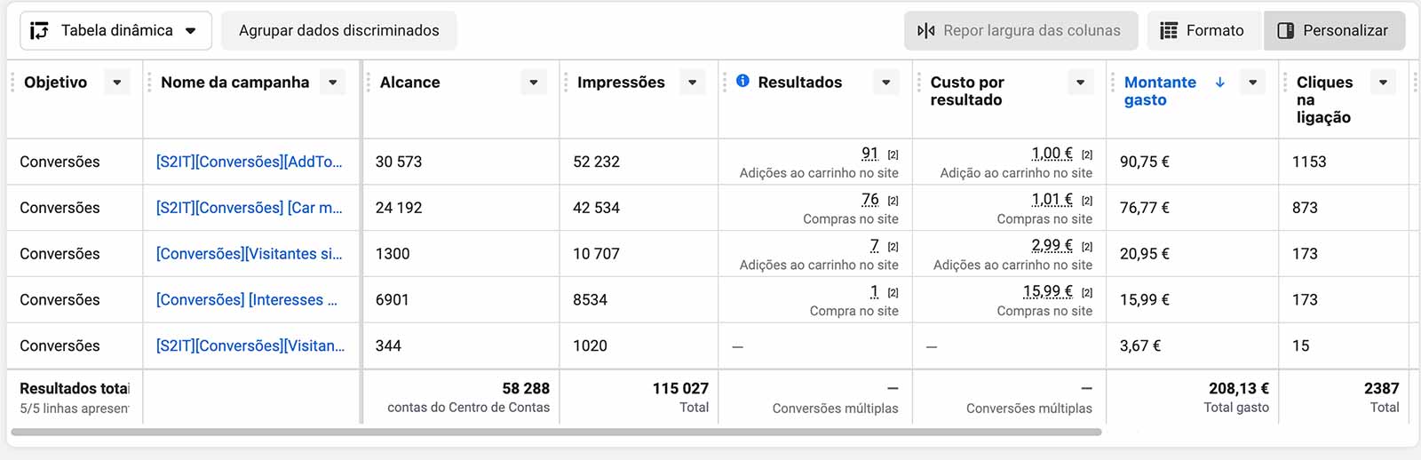 Só é possível ter bons resultados no Meta Ads com testes. Como podem ver na imagem abaixo, criámos campanhas de conversão e em algumas campanhas os resultados foram infrutíferos.