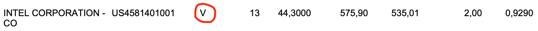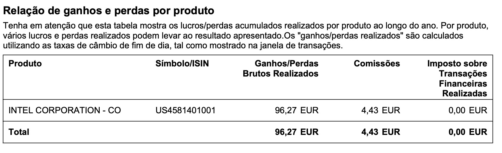 Vamos considerar o seguinte exemplo de mais-valias, de um relatório da Degiro.