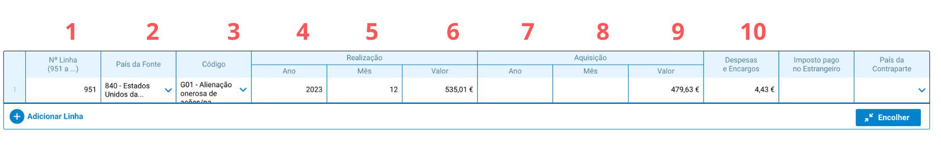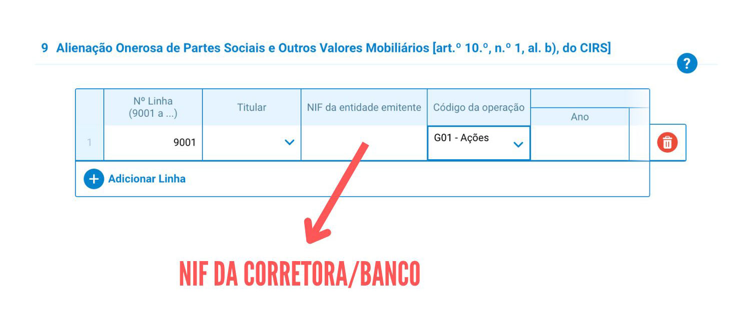 A tabela é idêntica, apenas terás que indicar o NIF da entidade emitente e o código de operações: G01 – Ações
