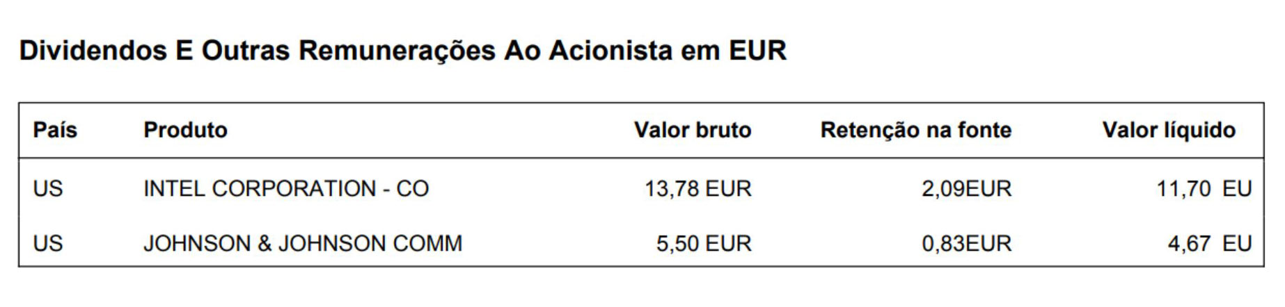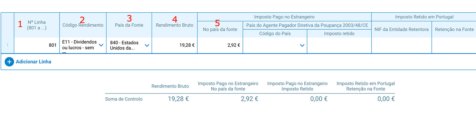 5. No país da fonte: Deves colocar o valor retido na fonte. Se investes em ações de EUA e tiveres o formulário w-8ben, quando recebes dividendos, será retido automaticamente 15%, como neste exemplo.