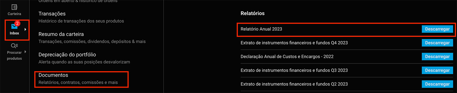 Para obteres o relatório anual com todas as tuas transações na Degiro, clica em Inbox > Documentos > Relatório Anual 2023