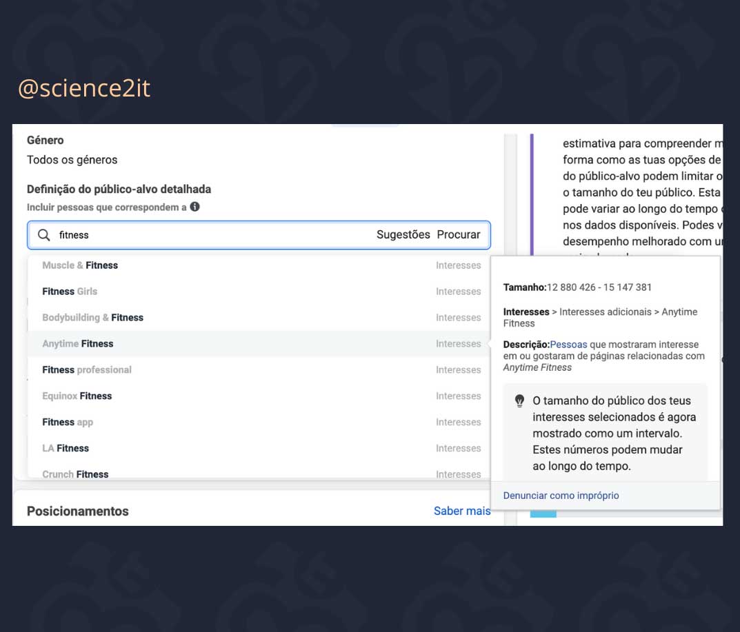 Neste exemplo, como pretendemos vender uma proteína whey, vamos escrever fitness nos critérios do público-alvo e vão aparecer vários interesses. Vamos escolher os interesses que fazem mais sentido para o nosso público-alvo.