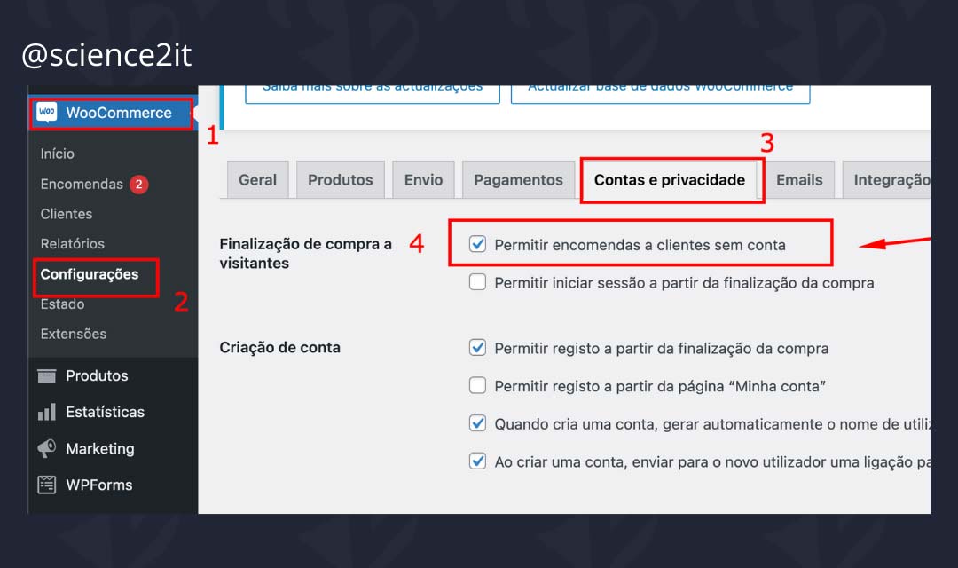 Depois abre o separador Contas e Privacidade e ativa a opção Permitir encomendas a clientes sem conta.